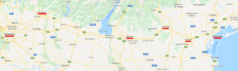 Tym razem opiszę Wam pomysł na mniej więcej tygodniowy objazd Północnych Włoch, najważniejsze i najciekawsze miasta, które możecie po drodze odwiedzić. Cześć miejsc była już opisana na blogu, część pojawia się po raz pierwszy. Oczywiście wybór zależy od Was i na pierwszą podróż nie musicie odwiedzać wszystkich miejscowości. Wyjazd jest dosyć intensywny, z częstym zmienianiem noclegów. Można też wybrać noclegi w kilku punktach (Bergamo, Wenecja i np. Padwa), i robić jednodniowe wycieczki do pozostałych miejsc. Całą podróż możemy przemieszczać się bez samochodu, wygodnym i częstymi pociągami. Ja sama podobną podróż zrealizowałam kilka lat temu, to była moja pierwsza podróż solo i do tej pory wspominam ją z wielkim sentymentem.